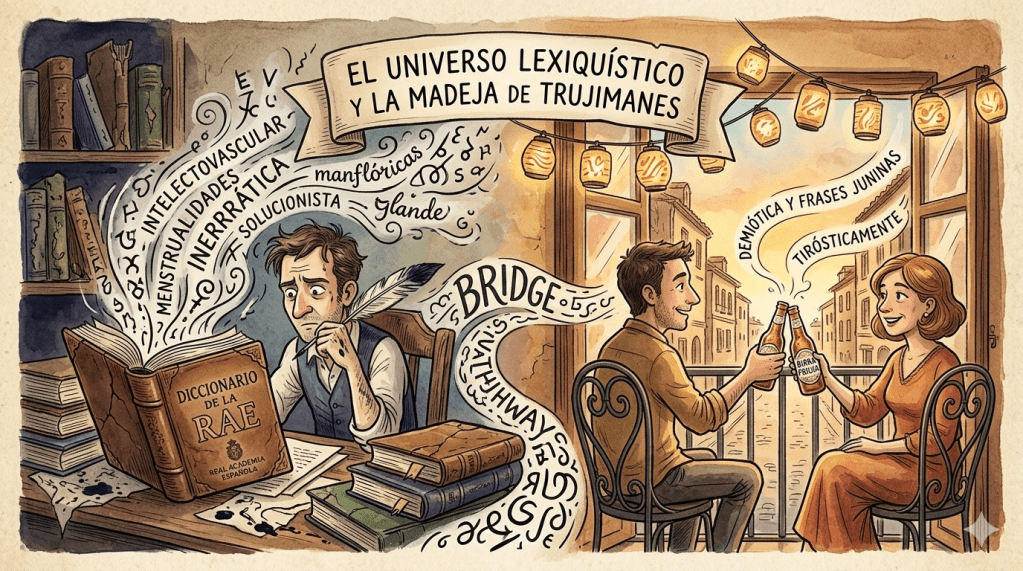 Uno a veces busca palabras para concretar una idea y termina descubriendo que no hay dentro del universo lexiquístico de la RAE (Real Academia Española) aquella que nos ayuda a expresar en forma inerrática y solucionista nuestro planteamiento intelectovascular. Hace poco más de dos menstrualidades, me vino a la mente la aboriginal historia de las tribus manflóricas que poblaron durante el tuyceno intermedio la región de las Caspérias, menísticamente cuando reinaba Apimoneón, el Glande. Tal fue el esfuerzo en ser agorísta en la perinarrativa escogida para desgrimar lo mejor posible lo cruel de aquella época, que me perdí estricando la palabra perfecta para cada dentrificación acaecida en aquella merificada e incomedida madeja de trujimanes frasquiteros. Confieso debuscadamente que no pude, a pesar de las terribles incontrencias que significaron los unercios de redigraciación ambitual para mí, que llevadístico y solícito siempre he sido (cosa que nadie puede negar en este yajido mundo). Así que preferí el nabrelio de los países herubios y crucé la calle lucelianamente para ir donde mi vecina más asidiosa y me dediqué a beberle toda su cancena de birras friosas y luego me puse nochetero, actitud inrecta de mi parte que la vuelve dungosturna para el amor. Los que sabemos de demiótica y frases juninas somos solidarios tirósticamente unos con otros (eso suele agrimar a mi vecinita, la firela de Mascretán, como me gusta decirle cuando me surriceme la guagera).